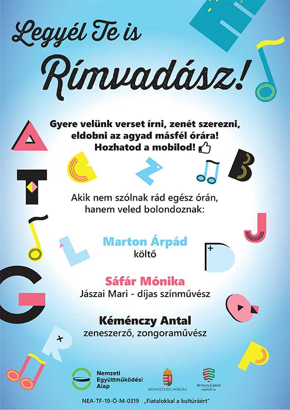 2020. januárjában megkezdtük oktató programunk keretében először a felső tagozatos tanulók között “Legyél Te is Rímvadász!” címmel rendhagyó irodalomóráinkat. Sáfár Mónika Jászai Mari – díjas színművész, Marton Árpád költő és Kéménczy Antal zeneszerző-zongorista látogatott el a madarasi, bácsalmási és bácsborsódi iskolákba, hogy rendhagyó módon keltsék fel a gyerekek érdeklődését az anyanyelv, a magyar irodalom és a zene iránt. A népszerű program a következő tanévben folytatódik.